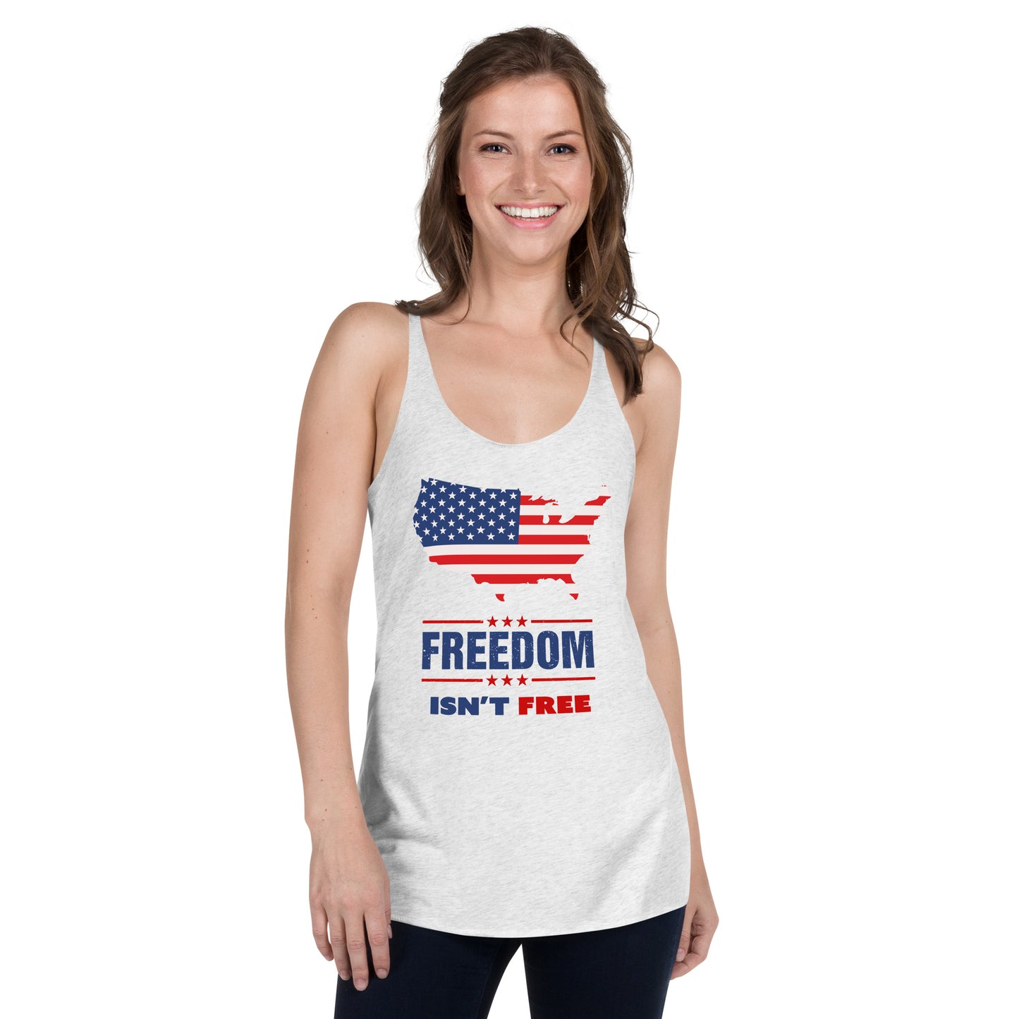 Embrace your American pride and support for veterans with our "Freedom Isn't Free" women's racerback tank, featuring a US flag map of the United States. This tank top is perfect for showcasing your patriotism during the 2024 election season and beyond.