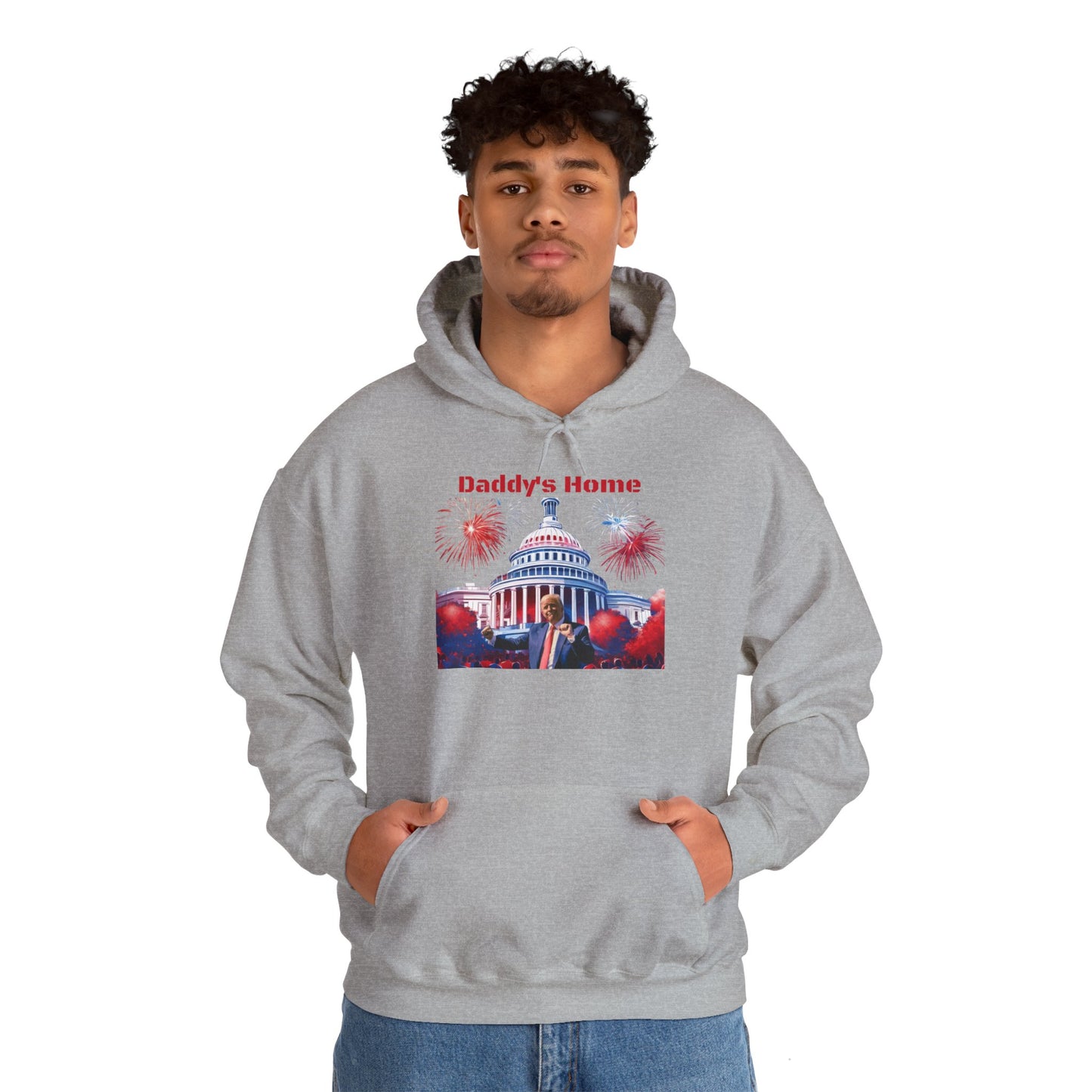Celebrate Trump’s 2024 election win with this one-of-a-kind “Daddy’s Back” hoodie, exclusively from J & K Printhouse! Featuring a spirited design of President Trump smiling in front of the White House, with fireworks lighting up the background, this hoodie is a fun and bold choice for Trump supporters. Made with a warm, plush Gildan heavy-blend fabric, this cozy hoodie is available in a variety of colors and is produced on demand to support thoughtful, eco-friendly purchasing.