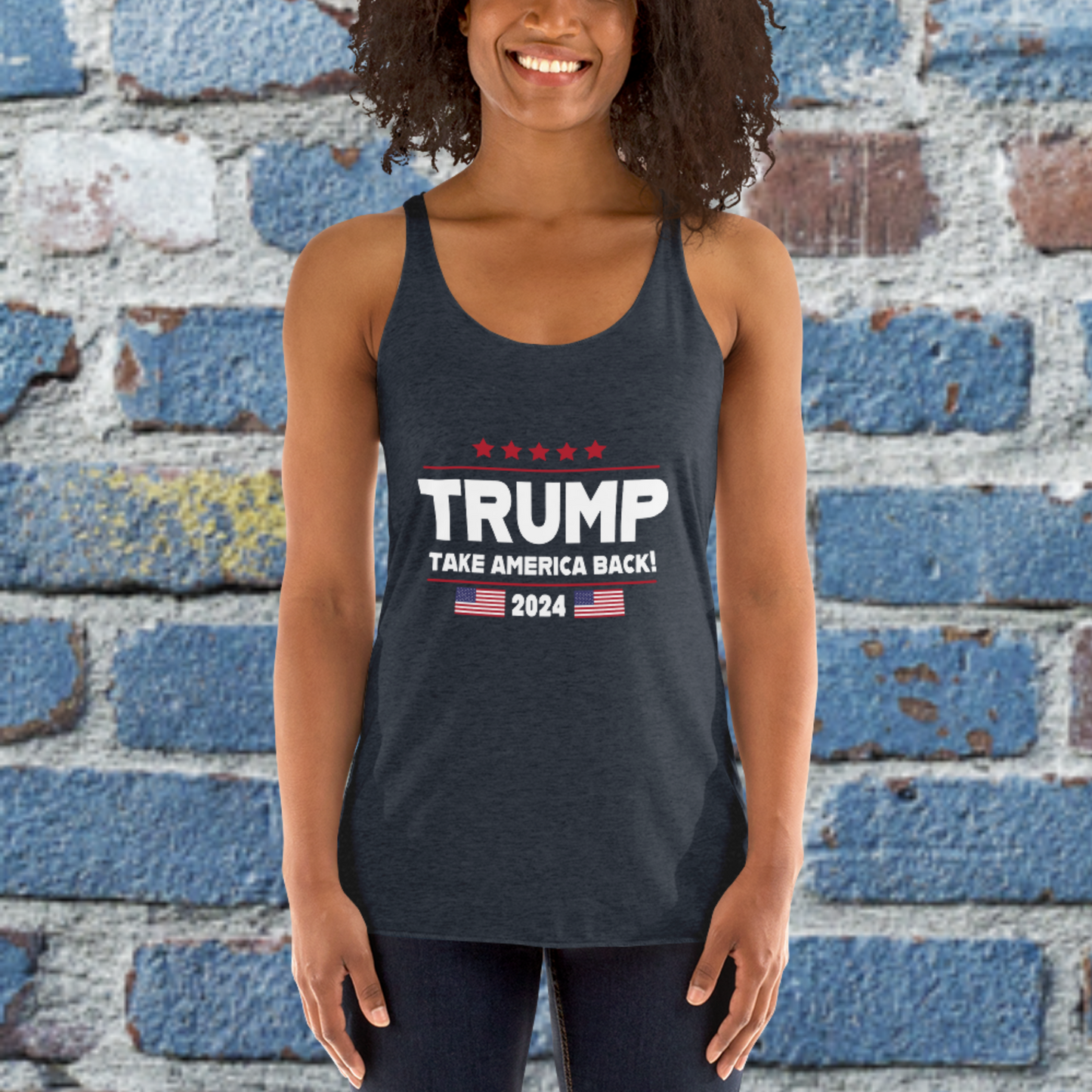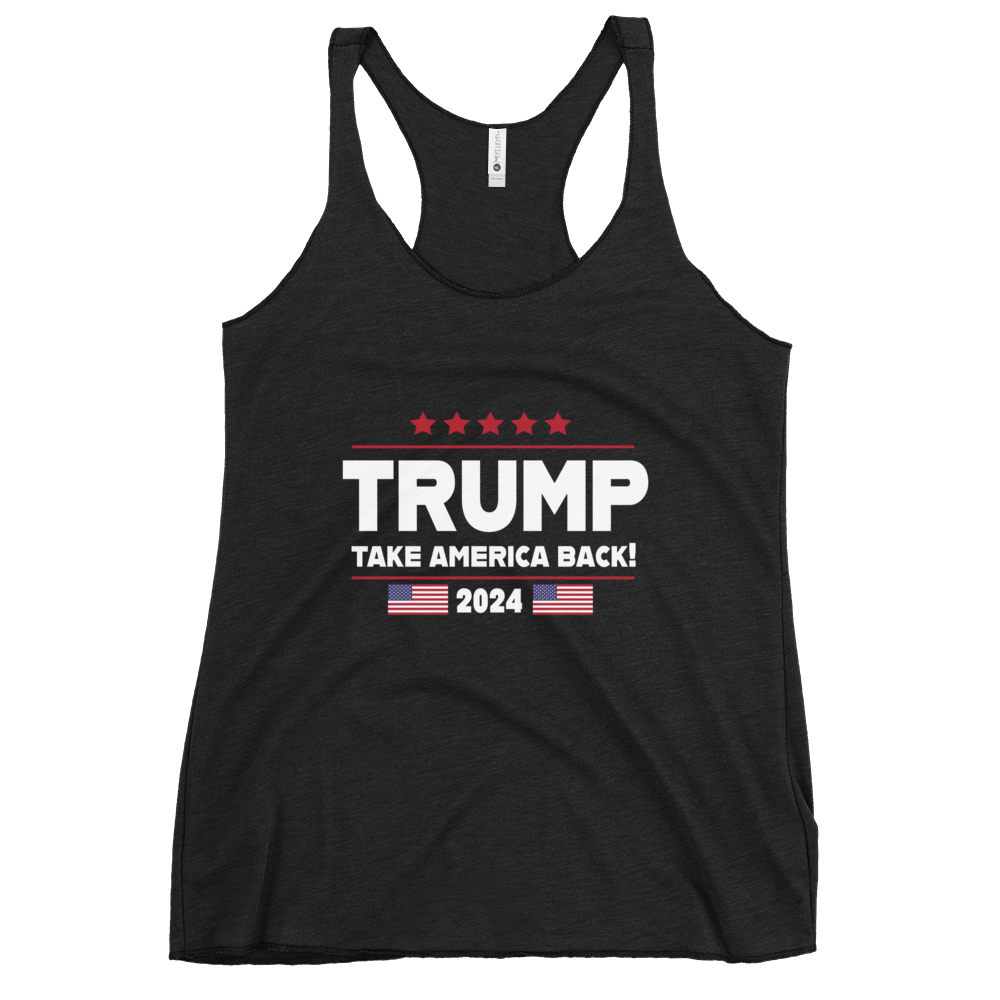 Show your support for Trump in the 2024 election with our "Trump Take America Back" women's dark racerback tank. Perfect for pro-Trump enthusiasts and fans of politically incorrect humor, this tank is a stylish way to express your political stance. Made from a blend of polyester, combed ring-spun cotton, and rayon, it offers a soft, lightweight, and form-fitting design with a flattering cut. The raw edge seams add an edgy touch, making it ideal for any casual outing. Stand out and make a bold statement with this essential political apparel for the 2024 election year!