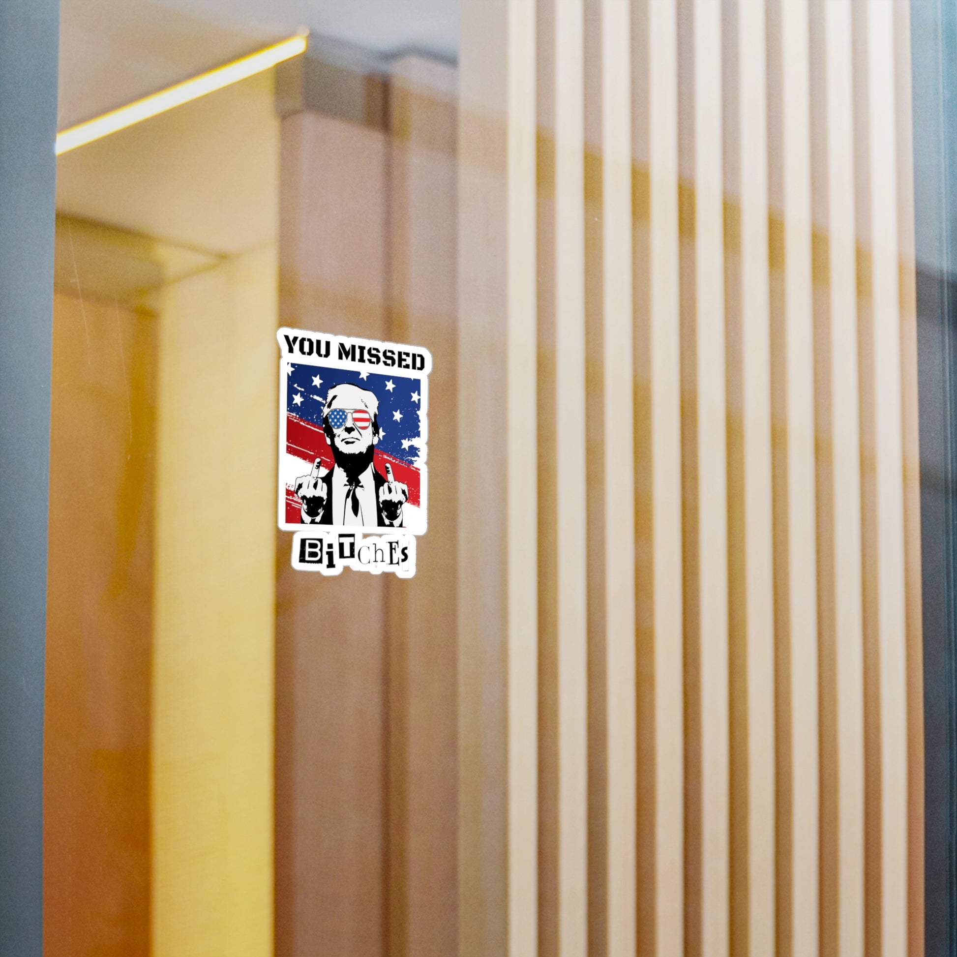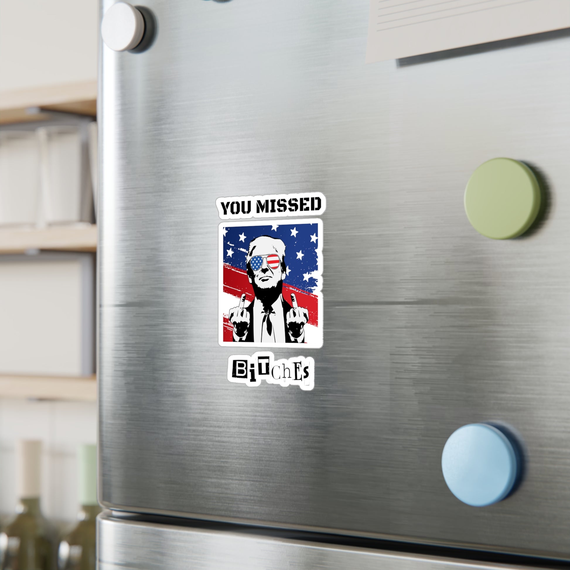 Show your unwavering support for Donald Trump with these bold kiss-cut vinyl decals, featuring Trump flipping the middle fingers and a tattered flag in the background with the defiant phrase "You Missed Bitches." Perfect for those who appreciate politically incorrect humor and want to make a statement, these decals are ideal for laptops, cars, water bottles, and more.