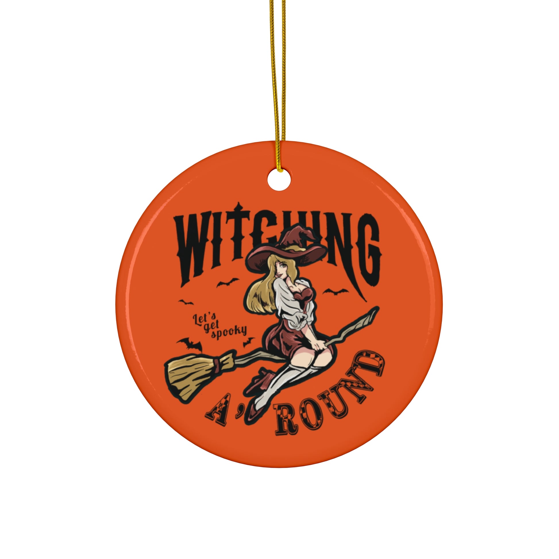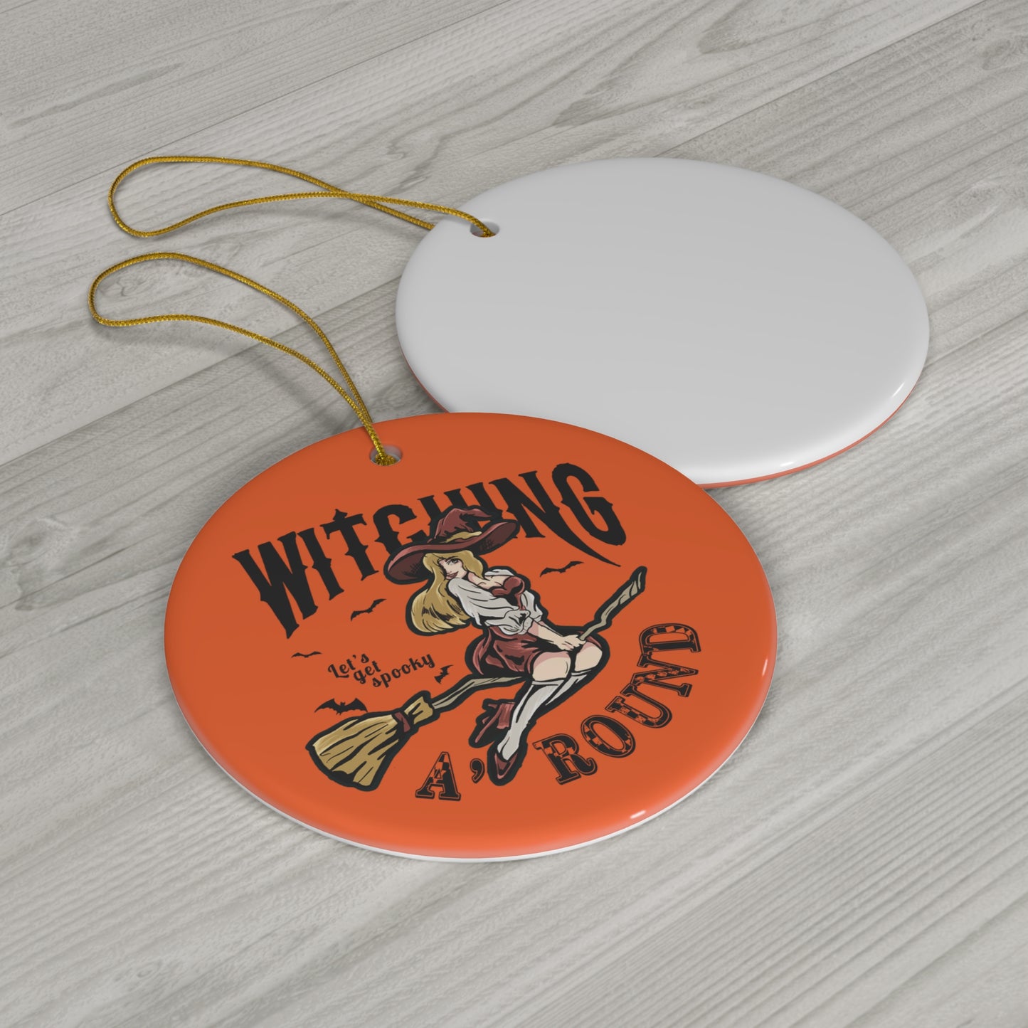 Witching A'Round Orange Ceramic Halloween Ornament | Spooky Witch Design